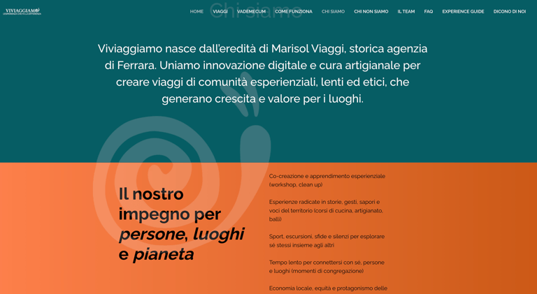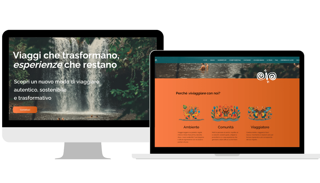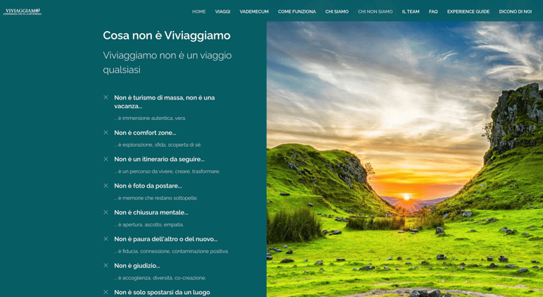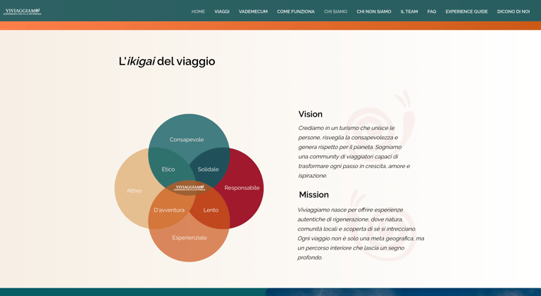 Per consolidare la presenza online di Viviaggiamo ho progettato un sito web che va oltre la semplice vetrina. Catalogo viaggi, vademecum del viaggiatore responsabile, l'ikigai del brand e una distintiva sezione "Chi non siamo" raccontano un'identità chiara e valoriale. Nessun acquisto con un click: ogni viaggio nasce da un dialogo, attraverso un form di contatto che apre la relazione. Un ecosistema digitale pensato per attrarre viaggiatori consapevoli, costruire community e coinvolgere nuovi Experience Guide.